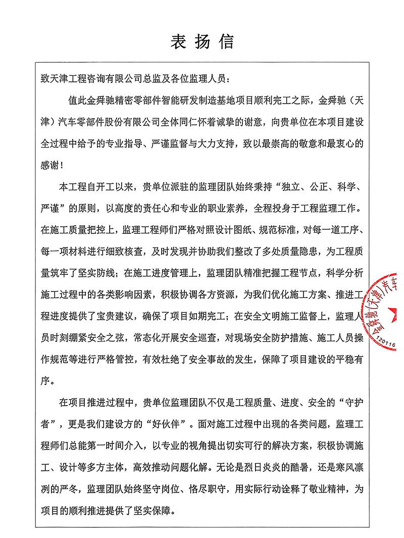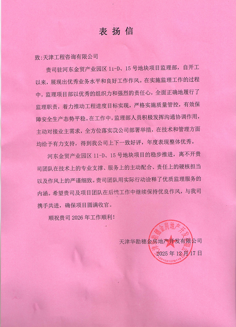天津華勘穗金房地產公司、中同銀龍(天津)公司也先后發來表揚信,對天津咨詢河東金貿產業園區11-D、15號項目團隊和中同銀龍(天津)滅菌中心建設項目的監理工作予以表揚感謝,認為我司項目監理部積極主動對接業主需求,溝通協調參建各方,過程中加強技術管理支撐和質量安全風險防控,用“事事落地、件件閉環”的擔當,筑牢項目落地的責任防線,用實際行動詮釋了優質監理服務的內涵。