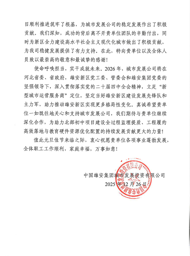 雄安集團城發公司發來感謝信,對天津咨詢在雄安新區實現“上臺階”年之際,在北部初中、大學城配套二期項目監理全過程中,以高度責任感和使命感,嚴控質量安全進度,精準監督施工細節、及時協調突發問題,以專業、嚴謹、高效筑牢項目根基,為新區建設添力。