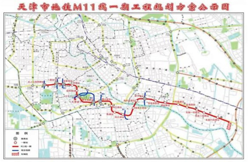 天津地鐵11號線一期工程線路全長22.6公里,共設(shè)21座車站,均為地下站。在東麗區(qū)設(shè)置七經(jīng)路定修段一座。本工程設(shè)有兩座主變電所,新建六里臺主所1座與7號線共享,新建馴海路主所1座,與Z1線共享,正線設(shè)置牽引變電所11座,定修段獨立設(shè)置 1座牽引變電所。控制中心一處,設(shè)置在華苑車輛段內(nèi),另外在七經(jīng)路定修段設(shè)備用控制中心一處。概算總投資256.02億元。